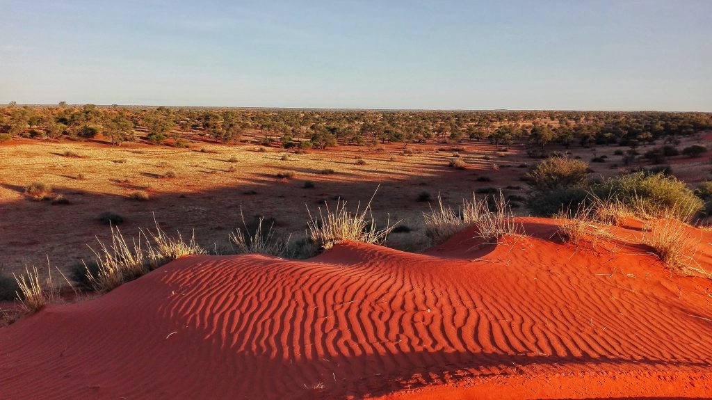 Преобладающий цвет Калахари – оранжево-красный. Пустыня представлена песчаной равниной, прерывающейся иногда горными хребтами и каменистыми участками.