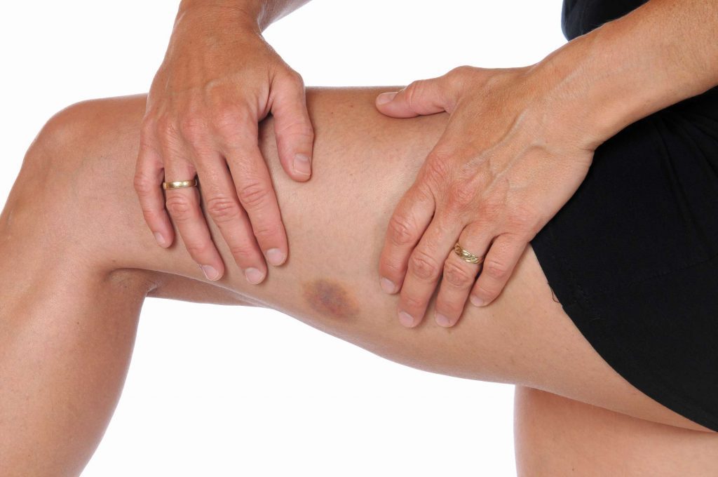 Нужно тщательно прощупать синее пятнышко на ноге. Если оно расположено на сосуде и имеет выпуклую форму, то можно подозревать тромбофилию. Обычно синяк от тромба на голени вызывает неприятное ощущение, краснеет и опухает. Необходима врачебная консультация, аппаратная диагностика и дальнейшее серьезное лечение.